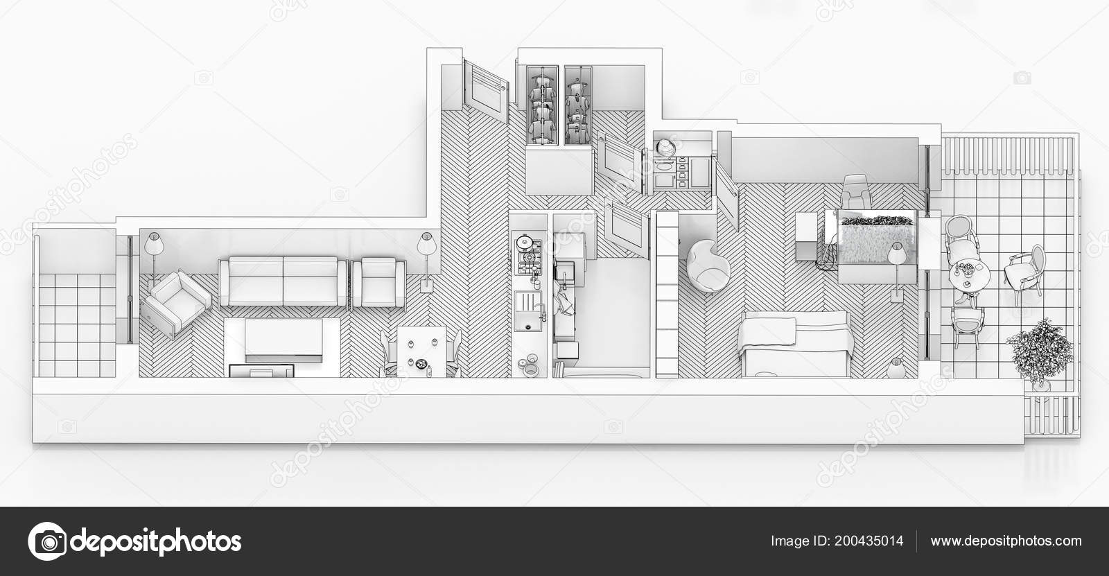 Line Drawing Floor Plan White Background Mock Furnished Home